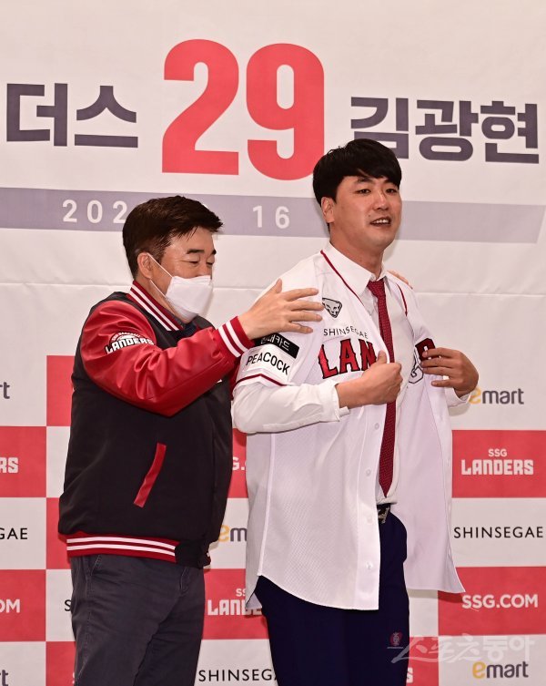 SSG 김광현이 16일 인천 연수구 오라카이 송도파크호텔에서 열린 SSG 랜더스 입단식 및 기자회견에서 민경삼 사장의 도움을 받아 유니폼을 입고 있다.