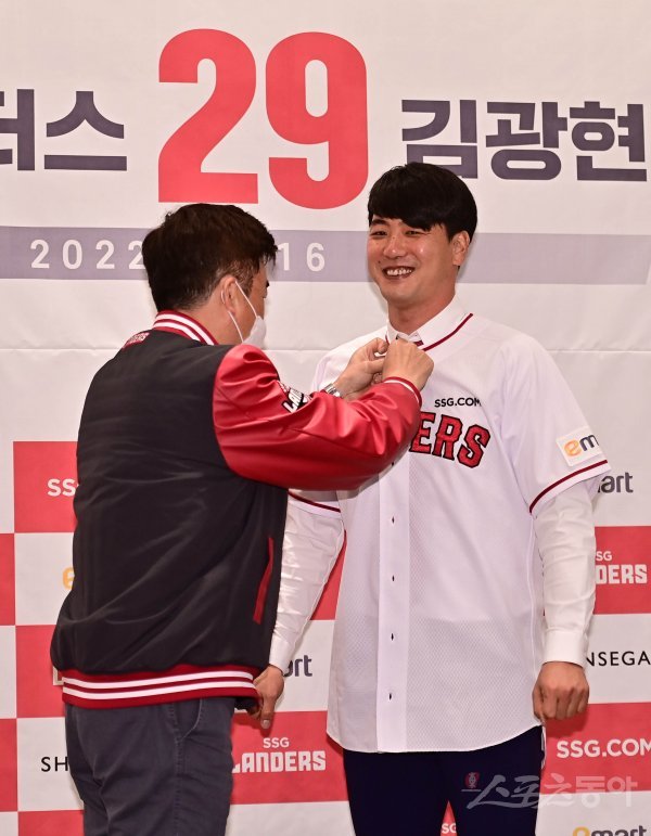 SSG 김광현이 16일 인천 연수구 오라카이 송도파크호텔에서 열린 SSG 랜더스 입단식 및 기자회견에서 민경삼 사장의 도움을 받아 유니폼을 입고 있다.