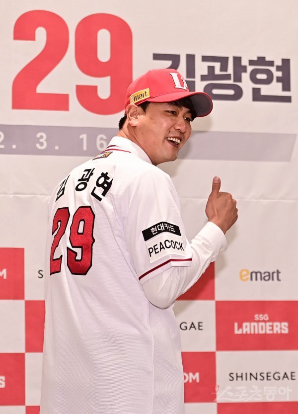 SSG 김광현이 16일 인천 연수구 오라카이 송도파크호텔에서 열린 SSG 랜더스 입단식 및 기자회견에서 기념 촬영을 하고 있다.