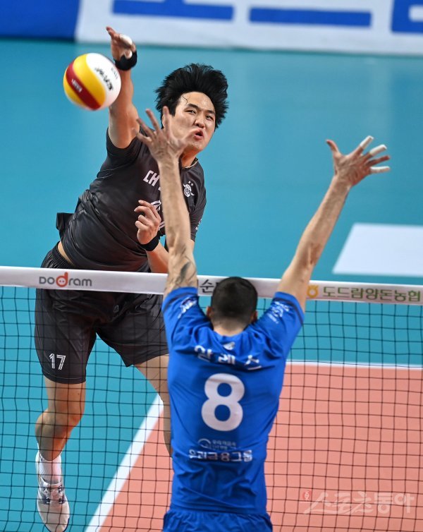 16일 서울 장충체육관에서 열린 ‘2021~2022 도드람 V-리그’ 남자부 3위 우리카드와 1위 대한항공 경기에서 대한항공 임동혁이 우리카드의 블로킹 사이로 스파이크를 날리고 있다.
