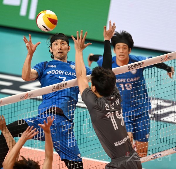16일 서울 장충체육관에서 열린 ‘2021~2022 도드람 V-리그’ 남자부 3위 우리카드와 1위 대한항공 경기에서 우리카드 하현용이 대한항공의 블로킹 사이로 밀어넣기 공격을 하고 있다.