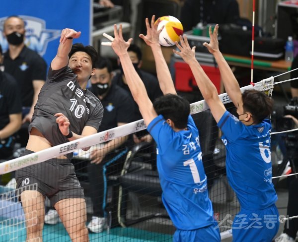 16일 서울 장충체육관에서 열린 ‘2021~2022 도드람 V-리그’ 남자부 3위 우리카드와 1위 대한항공 경기에서 대한항공 정지석이 우리카드의 블로킹 사이로 스파이크를 날리고 있다.