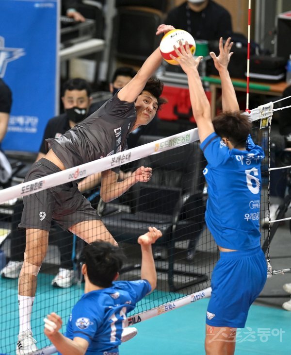 16일 서울 장충체육관에서 열린 ‘2021~2022 도드람 V-리그’ 남자부 3위 우리카드와 1위 대한항공 경기에서 대한항공 곽승석이 우리카드의 블로킹 사이로 스파이크를 날리고 있다.