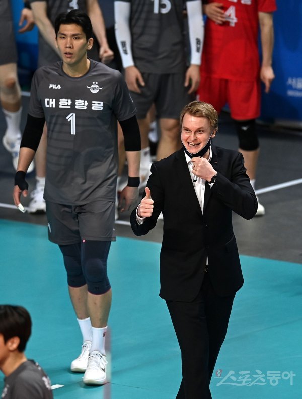 16일 서울 장충체육관에서 열린 ‘2021~2022 도드람 V-리그’ 남자부 3위 우리카드와 1위 대한항공 경기에서 대한항공 틸리카이넨 감독이 선수들을 향해 엄지손가락을 들어보이고 있다.