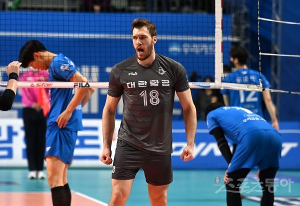 16일 서울 장충체육관에서 열린 ‘2021~2022 도드람 V-리그’ 남자부 3위 우리카드와 1위 대한항공 경기에서 대한항공 링컨이 득점에 성공한 후 기뻐하고 있다.