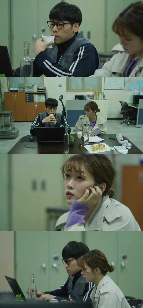 이런 가운데 정승네트워크 막내 라인 조충범(남현우 분)과 이예영(진아진 분) 만취 현장이 공개된다. 사진 속 두 사람은 정승네트워크 사무실에서 잔뜩 취한 얼굴로 나란히 앉아 있어 궁금증을 안긴다. 또한, 술을 마시면서도 노트북을 앞에 두고 깊은 고민에 빠진 듯한 두 사람 표정이 호기심을 더한다.