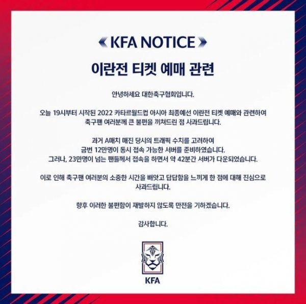 대한축구협회는 16일 밤 공식 SNS에 "이란전 티켓 예매와 관련, 축구 팬 여러분께 큰 불편을 끼쳐드린 점 사과드린다"는 글을 게재했다.