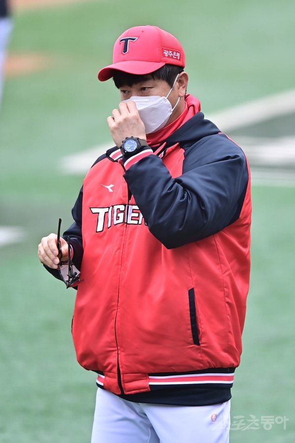 17일 경기도 수원KT위즈파크에서 열린 ‘2022 KBO 리그’ KT 위즈와 KIA 타이거즈의 시범경기에 앞서 KIA 김종국 감독이 마스크를 쓰고 있다.