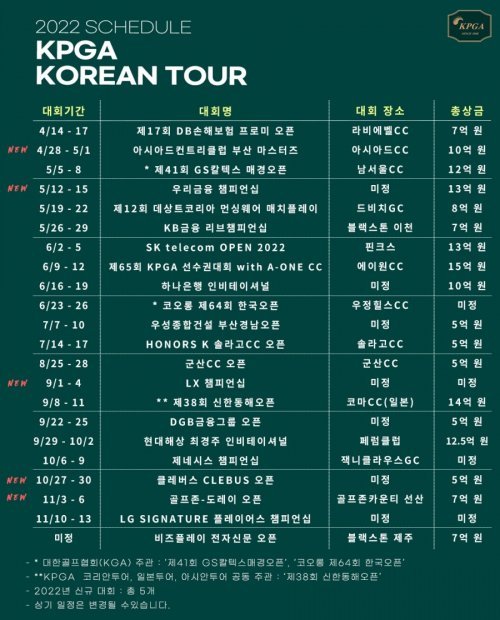개막전은 4월 14일부터 17일까지 강원 춘천 소재 라비에벨CC에서 펼쳐지는 ‘제17회 DB손해보험 프로미 오픈’이고, 시즌 최종전은 11월 10일부터 13일까지 열리는 ‘LG SIGNATURE 플레이어스 챔피언십’이다. 대회 장소는 추후 발표될 예정이다.