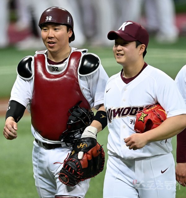 17일 서울 고척스카이돔에서 ‘2022 KBO리그’ 키움 히어로즈와 SSG 랜더스의 경기가 열렸다. 키움이 SSG를 상대로 4-1로 승리한 뒤 김재현과 김재웅이 미소를 짓고 있다.