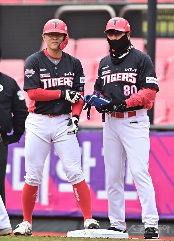 17일 경기도 수원KT위즈파크에서 열린 ‘2022 KBO 리그’ KT 위즈와 KIA 타이거즈의 시범경기에서 1회초 무사 KIA 김도영이 우전 안타를 쳐낸 뒤 1루 코치에게 보호 장비를 건네고 있다.