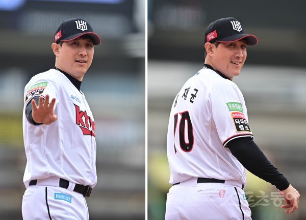 17일 경기도 수원KT위즈파크에서 열린 ‘2022 KBO 리그’ KT 위즈와 KIA 타이거즈의 시범경기에서 KT 황재균이 KIA 선수들에게 인사하고 있다.