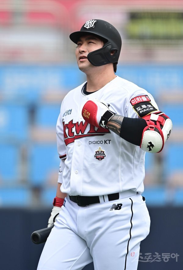 17일 경기도 수원KT위즈파크에서 열린 ‘2022 KBO 리그’ KT 위즈와 KIA 타이거즈의 시범경기에서 4회말 2사 KT 박병호가 삼진 아웃을 당한 뒤 더그아웃으로 향하고 있다.