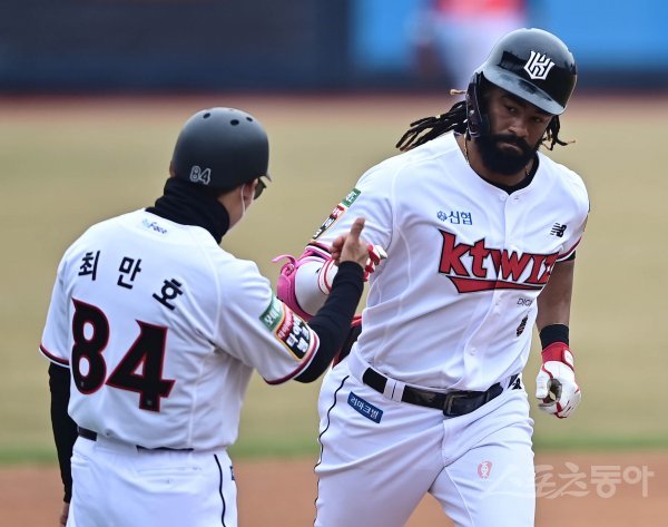17일 경기도 수원KT위즈파크에서 열린 ‘2022 KBO 리그’ KT 위즈와 KIA 타이거즈의 시범경기에서 5회말 무사 KT 라모스가 우월 솔로 홈런을 쳐낸 뒤 3루코치와 주먹을 맞대고 있다.