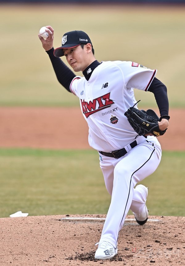 17일 경기도 수원KT위즈파크에서 열린 ‘2022 KBO 리그’ KT 위즈와 KIA 타이거즈의 시범경기에서 선발 투수로 마운드에 오른 KT 고영표가 역투하고 있다.