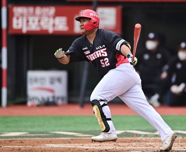 17일 경기도 수원KT위즈파크에서 열린 ‘2022 KBO 리그’ KT 위즈와 KIA 타이거즈의 시범경기에서 2회초 1사 KIA 황대인이 좌전 2루타를 치고 있다.