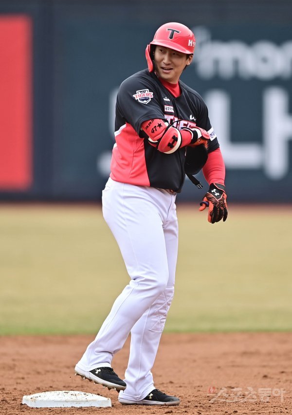 17일 경기도 수원KT위즈파크에서 열린 ‘2022 KBO 리그’ KT 위즈와 KIA 타이거즈의 시범경기에서 3회초 1사 2루 KIA 나성범이 선취 1타점 좌전 2루타를 쳐낸 뒤 웃고 있다.