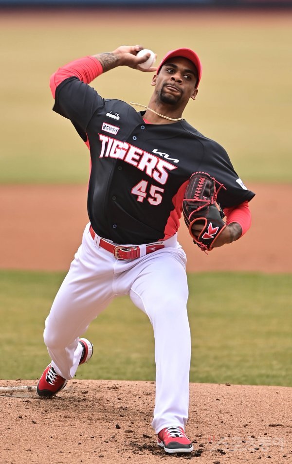 17일 경기도 수원KT위즈파크에서 열린 ‘2022 KBO 리그’ KT 위즈와 KIA 타이거즈의 시범경기에서 선발 투수로 마운드에 오른 KIA 로니가 역투하고 있다.
