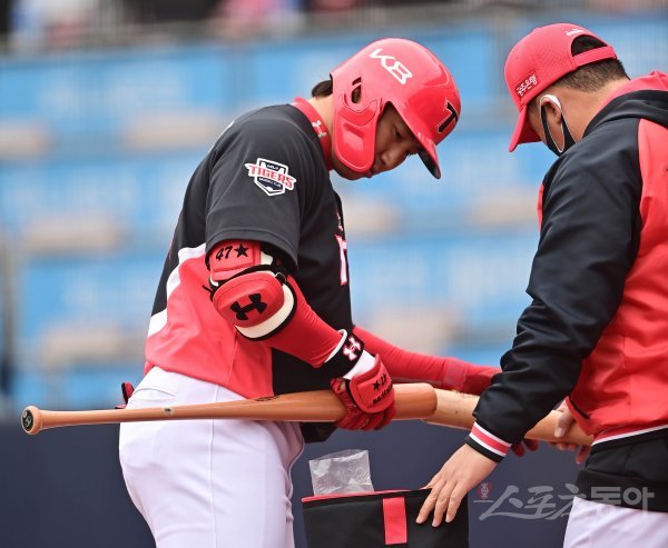 17일 경기도 수원KT위즈파크에서 열린 ‘2022 KBO 리그’ KT 위즈와 KIA 타이거즈의 시범경기에서 1회초 1사 1루 KIA 나성범이 배트를 교체하고 있다.