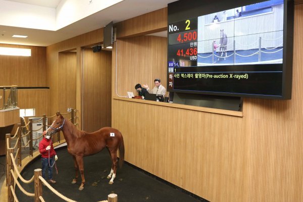 지난해 3월 경매와 비교해 상장두수는 비슷한 수준이지만 낙찰두수가 37두에서 76두로, 총낙찰액 역시 14억 3800만 원에서 29억 1900만 원으로 늘었다. 최고가는 부마 올드패션드와 모마 투리브포 사이에서 태어난 수말로 1억 4000만 원에 낙찰됐다. 이날 경매 현장에는 정기환 한국마사회장이 방문해 경주마 생산농가와 말산업 관계자들을 격려했다.