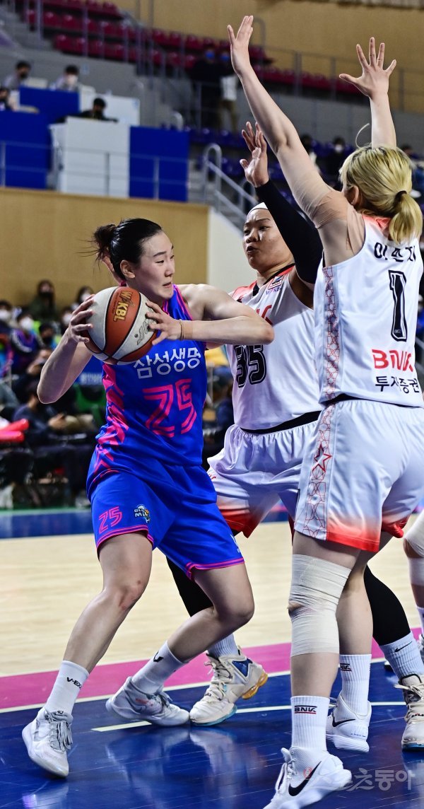 17일 경기도 용인실내체육관에서 열린 ‘삼성생명 2021-2022 여자프로농구’ 용인 삼성생명과 부산 BNK 썸의 경기에서 삼성생명 배혜윤이 BNK 김한별의 수비에 막혀 패스할 동료를 찾고 있다.