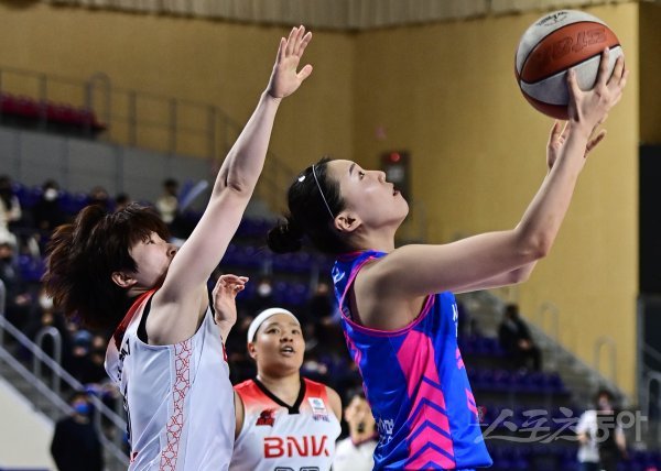 17일 경기도 용인실내체육관에서 열린 ‘삼성생명 2021-2022 여자프로농구’ 용인 삼성생명과 부산 BNK 썸의 경기에서 삼성생명 강유림이 슛을 하고 있다.