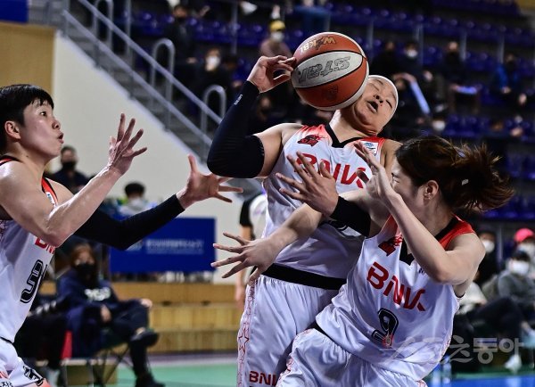 17일 경기도 용인실내체육관에서 열린 ‘삼성생명 2021-2022 여자프로농구’ 용인 삼성생명과 부산 BNK 썸의 경기에서 BNK 김한별이 리바운드를 하고 있다.