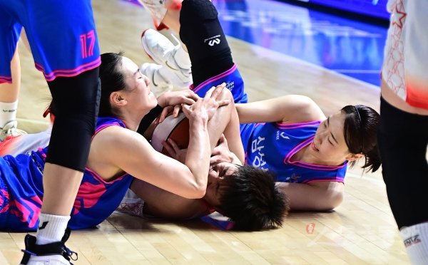 17일 경기도 용인실내체육관에서 열린 ‘삼성생명 2021-2022 여자프로농구’ 용인 삼성생명과 부산 BNK 썸의 경기에서 삼성생명 배혜윤과 박혜미가 BNK 진안의 볼을 빼앗는 과정에서 넘어지고 있다.