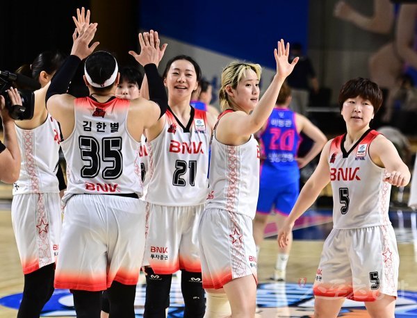 17일 경기도 용인실내체육관에서 열린 ‘삼성생명 2021-2022 여자프로농구’ 용인 삼성생명과 부산 BNK 썸의 경기에서 삼성생명에 68-58로 승리한 BNK 선수들이 기쁨을 나누고 있다.