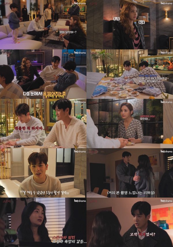 먼저 대저택에 모인 한채영(한채린 역)과 구자성(현승훈 역), 김윤서(현승지 역)는 친근하게 대화를 주고받으면서 편안한 분위기를 자아낸다. 아역배우 서우진(현진영 역)의 귀여운 매력에 푹 빠진 한채영은 애교 섞인 말투로 대화를 이어가고, 아이와 포옹을 하면서 활기찬 에너지를 발산하기도. 그녀는 촬영이 시작되자 단숨에 치명적인 ‘한채린’으로 돌변, 싸늘한 눈빛으로 180도 달라진 아우라를 풍기며 감탄을 불러일으킨다.