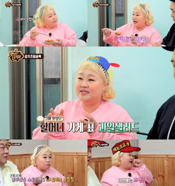 그런가 하면 홍윤화는 아직 한 입도 먹지 못한 ‘이십끼형’ 유민상에게 갈치 바르는 법을 알려줬고, “잘 좀 발라먹어”라며 또다시 ‘홍윤화 메들리’를 시작해 보는 이들에게 웃음을 안겼다. 특히 그녀는 누구보다 갈치의 살코기와 뼈를 완벽하게 분리해내는 ‘참빛 가시 발굴’ 기술(?)을 뽐내는 것은 물론 “오늘 머리 안 빗고 오신 것 같은데”라고 예능감까지 과시했다. 홍윤화는 ‘뚱3’에게 가자미 살코기들을 정성스럽게 발라주며 부캐 ‘홍엄마’를 소환하기도. 또한, 홍윤화는 후식으로 할머니가 만들어 주셨던 추억의 과일 샐러드를 제안, 완벽한 ‘단짠’ 조합을 완성하며 ‘맛잘알’의 면모를 자랑했다.