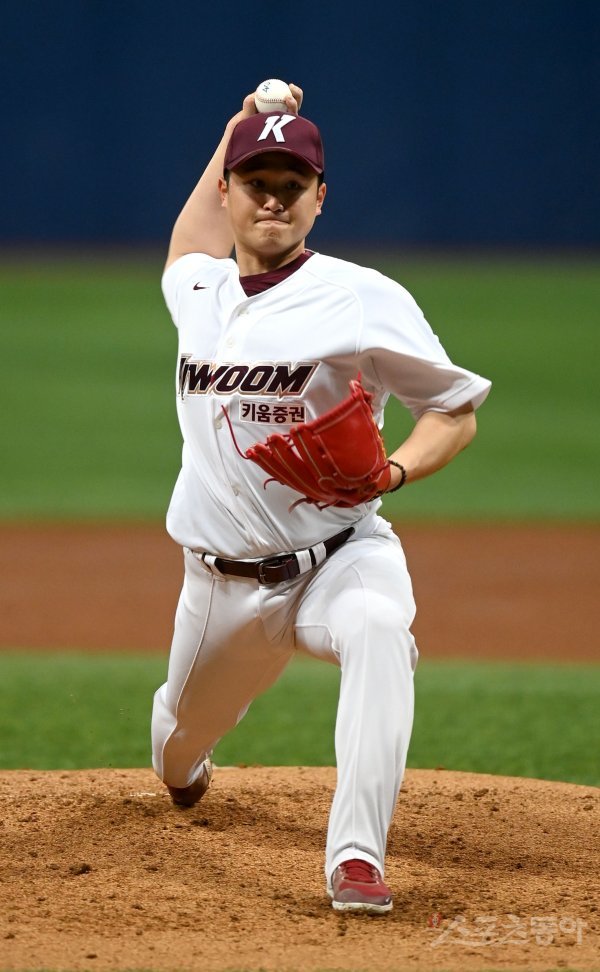 19일 서울 고척스카이돔에서 ‘2022 신한은행 MY CAR KBO리그’ 한화 이글스와 키움 히어로즈의 시범 경기가 열렸다. 선발 투수로 등판한 키움 최원태가 역투하고 있다.