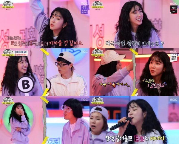 이날 ‘놀면 뭐하니?’에서는 본인이 알고 있던 MBTI와 실제 검사 결과가 다른 출연자를 찾기 위한 논쟁이 벌어져 흥미를 더했다. 누가 진짜 E(외향형)이고 I(내향형)인지 추리가 계속되는 가운데, E팀에 속한 진예는 적극적인 면모로 시청자들의 이목을 끌었다.