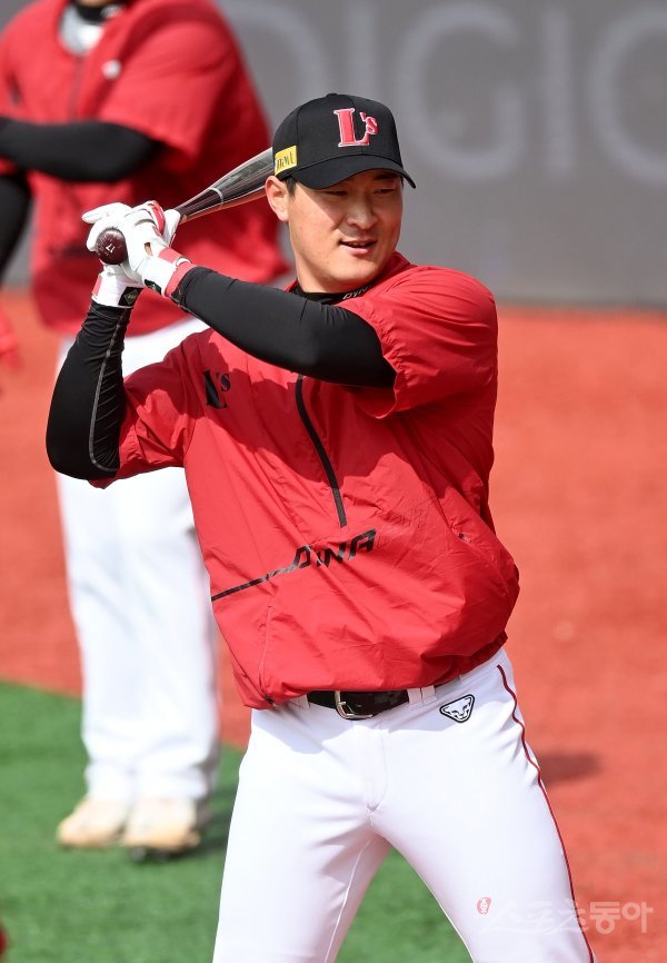 20일 수원KT위즈파크에서 ‘2022 신한은행 MY CAR KBO리그’ SSG 랜더스와 KT 위즈의 시범 경기가 열린다. 올 시즌 타자로 전향한 SSG 하재훈이 타격 훈련을 하고 있다.