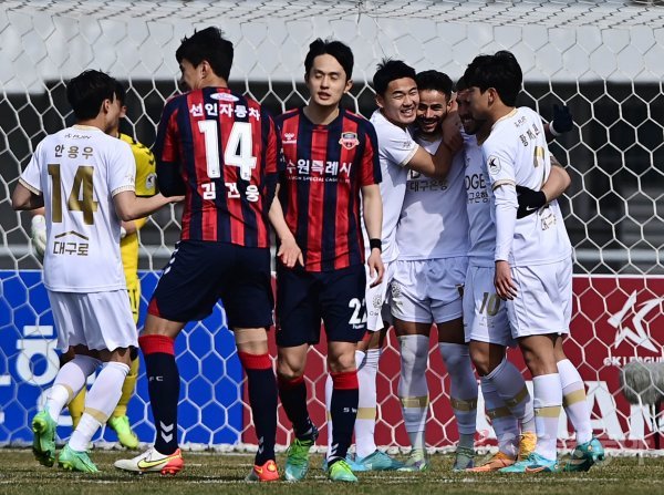 20일 경기도 수원종합운동장에서 열린 ‘하나원큐 K리그1 2022’ 수원FC와 대구FC의 경기에서 대구 세징야가 페널티킥으로 동점골을 성공시킨 후 동료들과 기쁨을 나누고 있다.