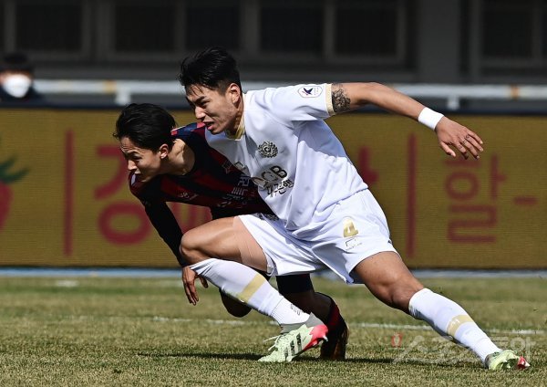 20일 경기도 수원종합운동장에서 열린 ‘하나원큐 K리그1 2022’ 수원FC와 대구FC의 경기에서 대구 정태욱이 수원FC 이승우를 수비하고 있다.