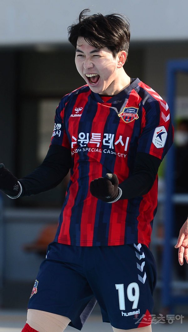 20일 경기도 수원종합운동장에서 열린 ‘하나원큐 K리그1 2022’ 수원FC와 대구FC의 경기에서 수원 FC 김승준이 추가골을 성공시킨 후 세리머니를 하고 있다.