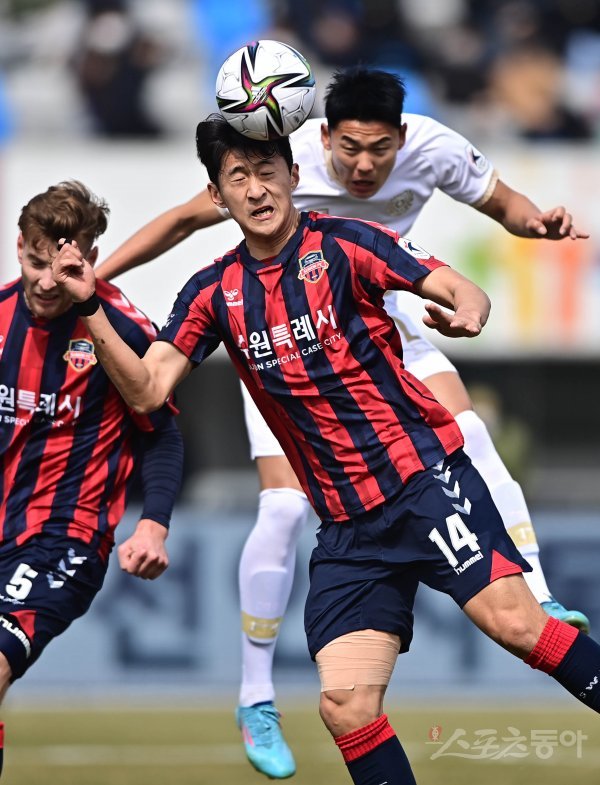 20일 경기도 수원종합운동장에서 열린 ‘하나원큐 K리그1 2022’ 수원FC와 대구FC의 경기에서 수원FC 김건웅이 볼을 헤딩으로 걷어내고 있다.