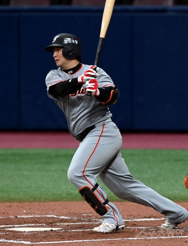 20일 서울 고척스카이돔에서 ‘2022 KBO리그’ 키움 히어로즈와 한화 이글스의 경기가 열렸다. 3회초 1사 3루에서 한화 최재훈이 1타점 내야 땅볼을 날리고 있다.