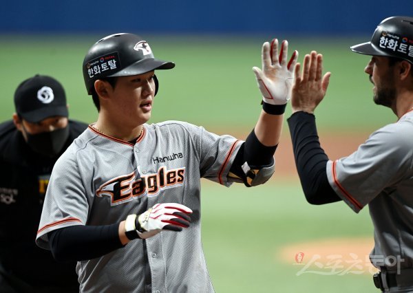 20일 서울 고척스카이돔에서 ‘2022 KBO리그’ 키움 히어로즈와 한화 이글스의 경기가 열렸다. 6회초 2사 3루에서 한화 정민규가 투런 홈런을 쏘아 올린 뒤 동료의 환영을 받고 있다.