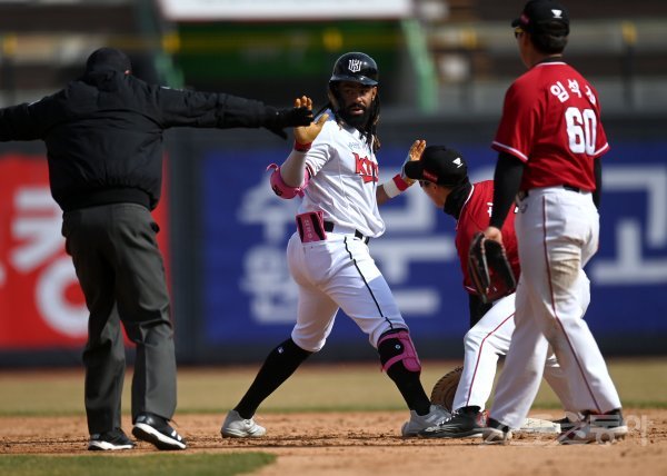 20일 수원KT위즈파크에서 ‘2022 신한은행 MY CAR KBO리그’ SSG 랜더스와 KT 위즈의 시범 경기가 열렸다. 5회말 2사 1루 KT 라모스가 1타점 중전 2루타를 치고 3루까지 달리다 협살에 걸렸으나 태그를 피해 2루로 귀루해 세이프 되고 있다.