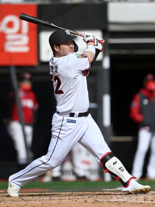 20일 수원KT위즈파크에서 ‘2022 신한은행 MY CAR KBO리그’ SSG 랜더스와 KT 위즈의 시범 경기가 열렸다. 5회말 2사 2루 KT 박병호가 1타점 우전 안타를 치고 있다.