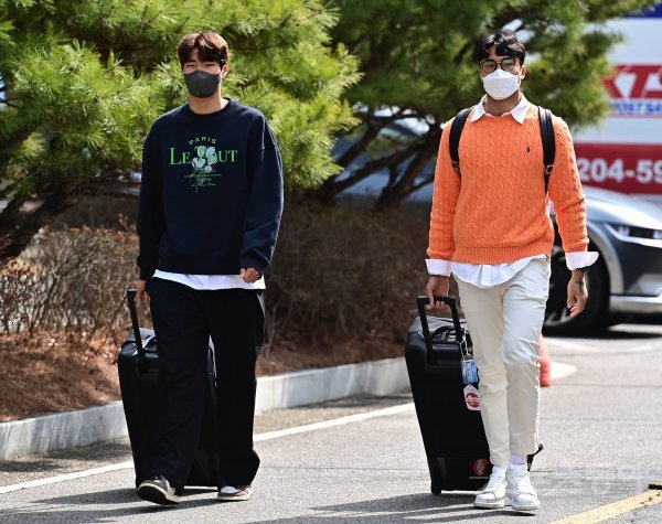 한국축구대표팀이 21일 경기도 파주 축구대표팀트레이닝센터(NFC)에서 ‘2022 FIFA 카타르 월드컵’ 이란, 아랍에미리트(UAE)와 최종 예선에 앞서 소집훈련을 진행했다. 축구대표팀 송범근과 김동준이 입소하고 있다.