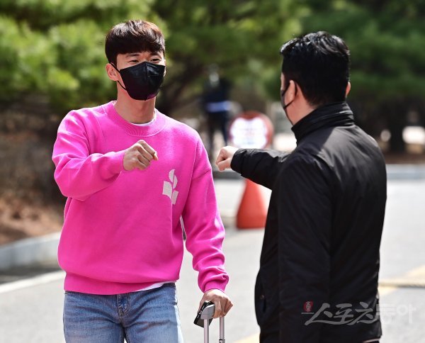 한국축구대표팀이 21일 경기도 파주 축구대표팀트레이닝센터(NFC)에서 ‘2022 FIFA 카타르 월드컵’ 이란, 아랍에미리트(UAE)와 최종 예선에 앞서 소집훈련을 진행했다. 축구대표팀 김진수가 축구협회 직원과 인사하고 있다.