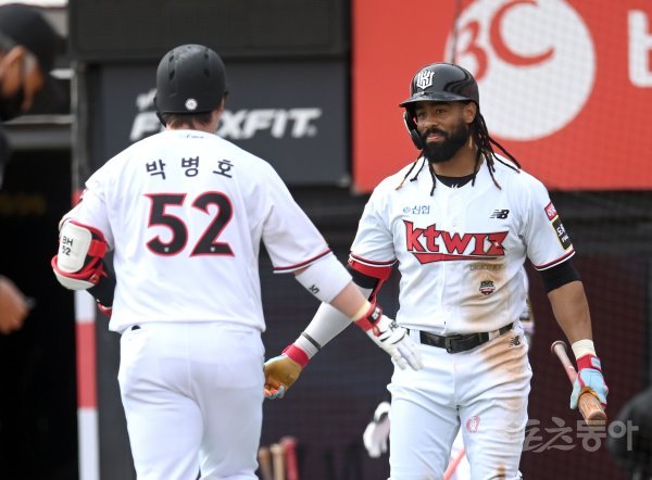 21일 수원KT위즈파크에서 ‘2022 신한은행 MY CAR KBO리그’ 한화 이글스와 KT 위즈의 시범 경기가 열렸다. 3회말 무사 KT 박병호가 좌월 솔로 홈런을 날리고 그라운드를 돌아 홈인해 라모스의 축하를 받고 있다.