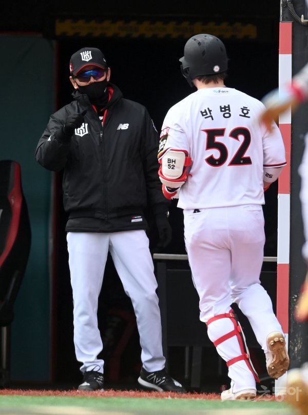 21일 수원KT위즈파크에서 ‘2022 신한은행 MY CAR KBO리그’ 한화 이글스와 KT 위즈의 시범 경기가 열렸다. 3회말 무사 KT 박병호가 좌월 솔로 홈런을 날리고 그라운드를 돌아 홈인해 이강철 감독의 축하를 받고 있다.