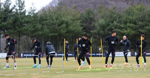 한국축구대표팀이 21일 경기도 파주 축구대표팀트레이닝센터(NFC)에서 ‘2022 FIFA 카타르 월드컵’ 이란, 아랍에미리트(UAE)와 최종 예선에 앞서 소집훈련을 진행했다. 축구대표팀 선수들이 몸을 풀고 있다.
