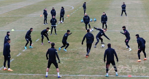 한국축구대표팀이 21일 경기도 파주 축구대표팀트레이닝센터(NFC)에서 ‘2022 FIFA 카타르 월드컵’ 이란, 아랍에미리트(UAE)와 최종 예선에 앞서 소집훈련을 진행했다. 축구 대표팀 선수들이 훈련을 하고 있다.