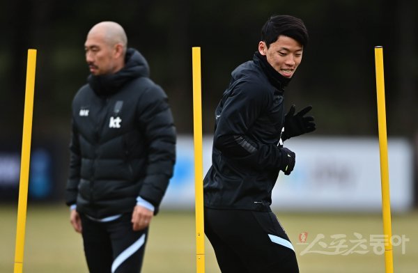 한국축구대표팀이 21일 경기도 파주 축구대표팀트레이닝센터(NFC)에서 ‘2022 FIFA 카타르 월드컵’ 이란, 아랍에미리트(UAE)와 최종 예선에 앞서 소집훈련을 진행했다. 축구대표팀 황희찬이 회복 훈련을 하고 있다.