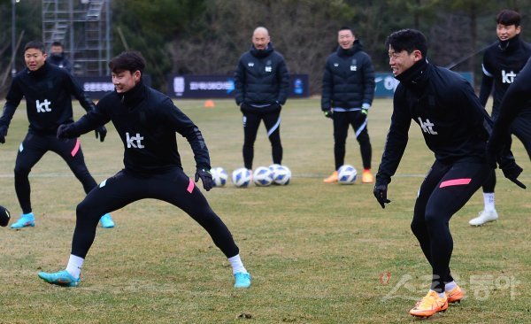 한국축구대표팀이 21일 경기도 파주 축구대표팀트레이닝센터(NFC)에서 ‘2022 FIFA 카타르 월드컵’ 이란, 아랍에미리트(UAE)와 최종 예선에 앞서 소집훈련을 진행했다. 축구대표팀 송민규와 황희찬이 훈련을 하고 있다.
